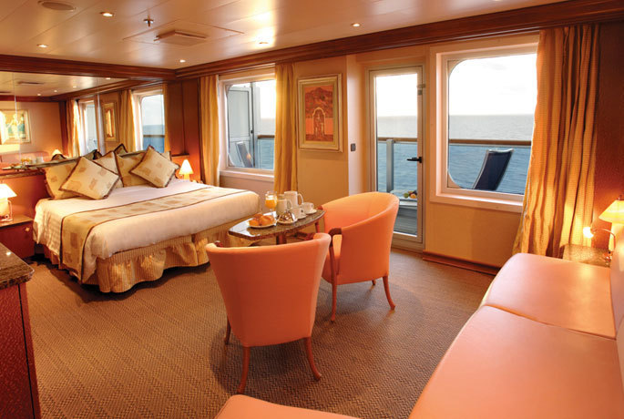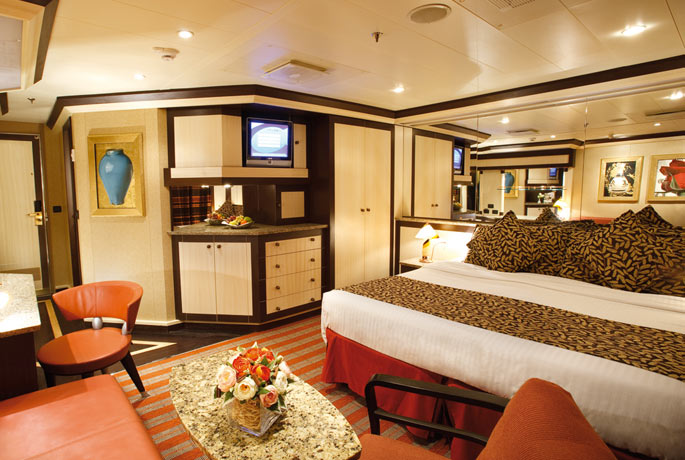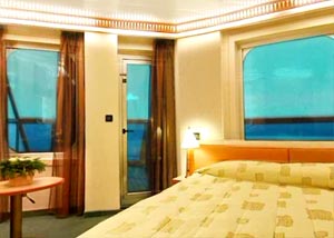 Oceanview with veranda, Two lower beds can convert to queen size, whirlpool bath, shower and sitting area. Direct dial, ship-to-shore telephone service, television, hair dryer, safe deposit box and mini-bar in every stateroom.