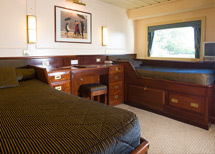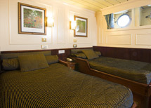 These cabins are located two decks below the Reception level. There are two twin berth cabins and two double-bedded cabins. Each cabin has two large portholes.